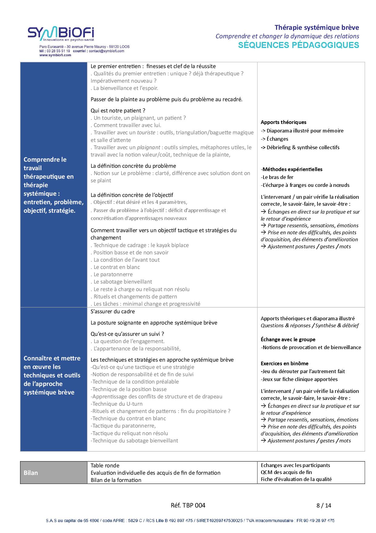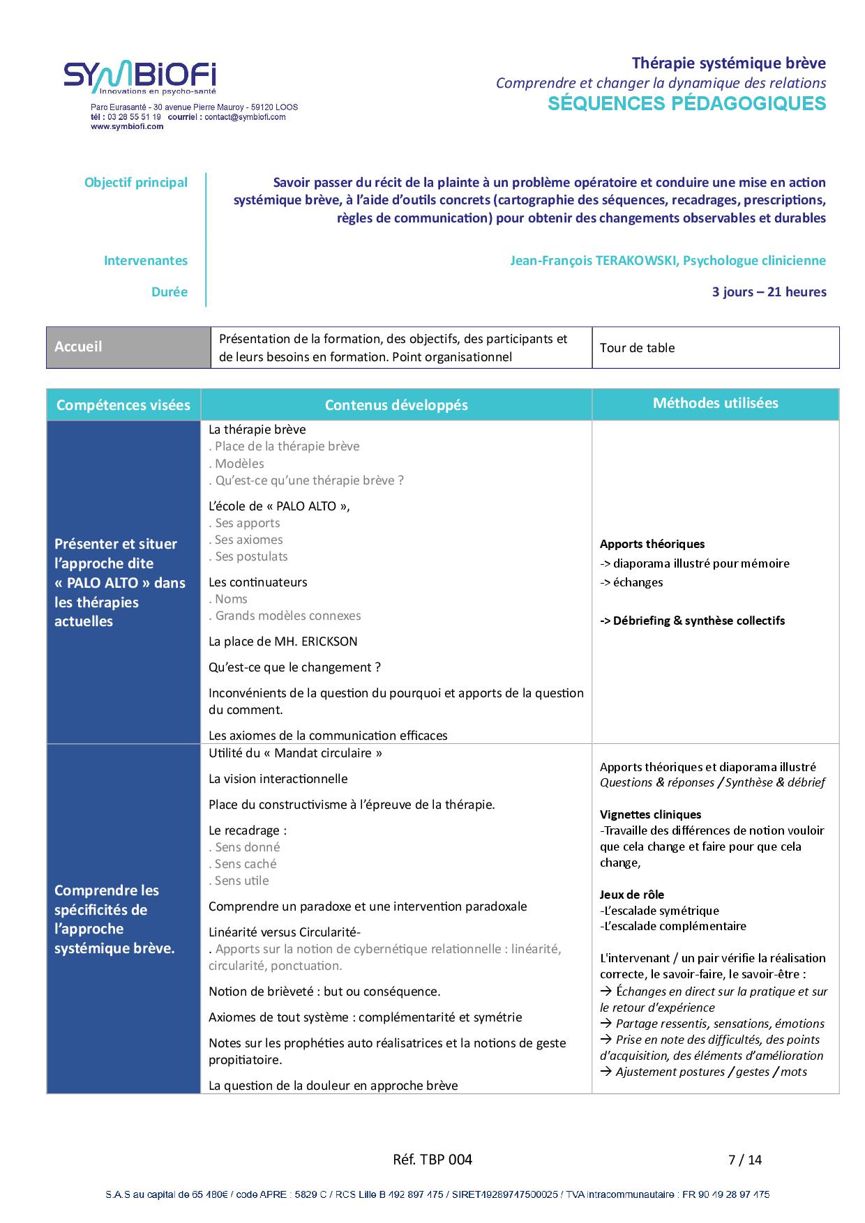 Objectif de la formation Thérapie systémique brève : savoir passer du récit de la plainte à un problème opératoire et conduire une mise en action systémique brève, à l’aide d’outils concrets (cartographie des séquences, recadrages, prescriptions, règles de communication) pour obtenir des changements observables et durables.
